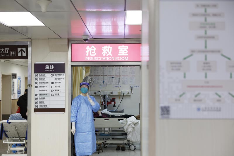 1月21日晚,在上海市同济医院急诊抢救室工作的医护人员。除夕夜,上海医务工作者在岗位上坚守,用专业和敬业守护病患。(图片来源:中新社)