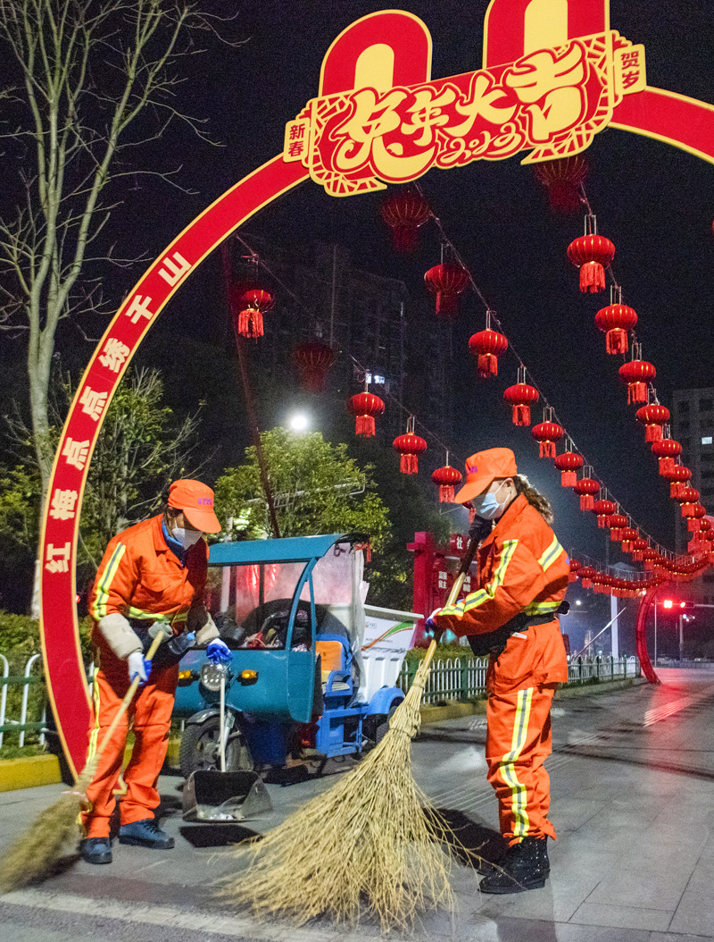 1月21日,在安徽省芜湖市繁昌区繁阳镇渡江大道上,环卫工人在进行保洁作业。(图片来源:新华社)