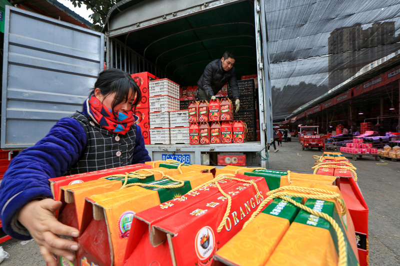 1月21日,工人在贵州省遵义市播州区龙坑街道农产品批发市场里搬运新鲜水果。(图片来源:新华社)