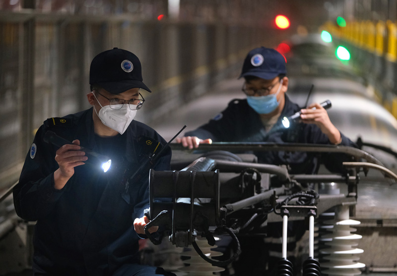 1月21日凌晨,机械师在天津动车客车段动车运用所检修库对进库的动车组列车高压供电系统设备进行检修。(图片来源:新华社)