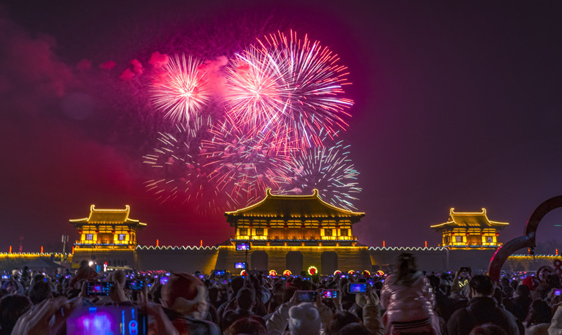 1月22日,在河南省洛阳市洛龙区定鼎门广场,市民观赏焰火晚会。(图片来源:本文图片除标注外均综编自新华社)