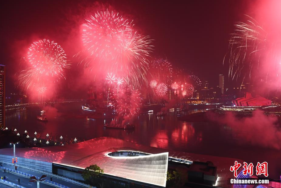 1月21日晚,首届重庆都市艺术节跨年焰火表演在中心城区江北、渝中、南岸的长江与嘉陵江两江交汇附近水域进行燃放,为市民营造出“欢乐祥和、喜庆热烈”的城市节日氛围。(图片来源:中新网)