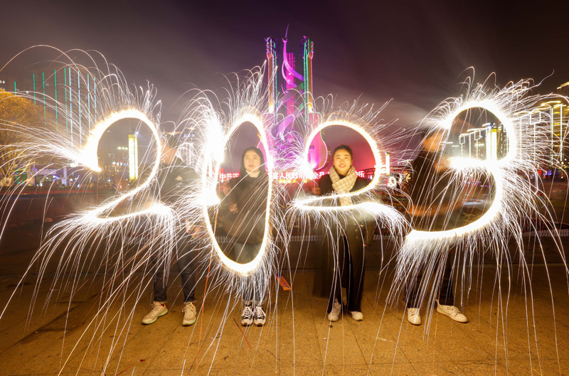 1月21日除夕夜,在贵州省遵义市正安县吉他文化广场,市民用烟花光绘出“2023”。