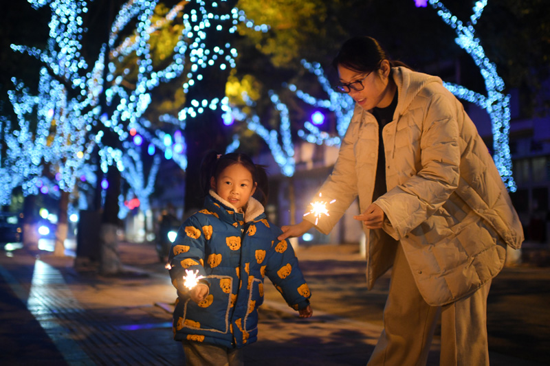 1月21日除夕夜,在浙江省舟山市岱山县,小朋友跟着家长一起燃放烟花。