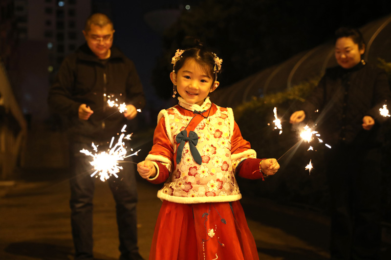 1月21日除夕夜,在云南省昆明市,一名小朋友在大人的陪伴下燃放烟花。