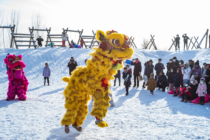 1月25日,中国农历癸卯兔年正月初四,市民在北京市房山区的一处人造冰雪乐园内欣赏雪地舞狮,并与舞狮近距离互动体验。(图片来源:中新社)