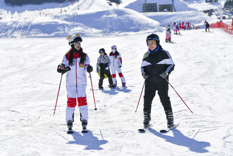 1月25日,新疆丝绸之路国际度假区滑雪教练(左)为学员讲授滑雪技巧。(图片来源:新华社)