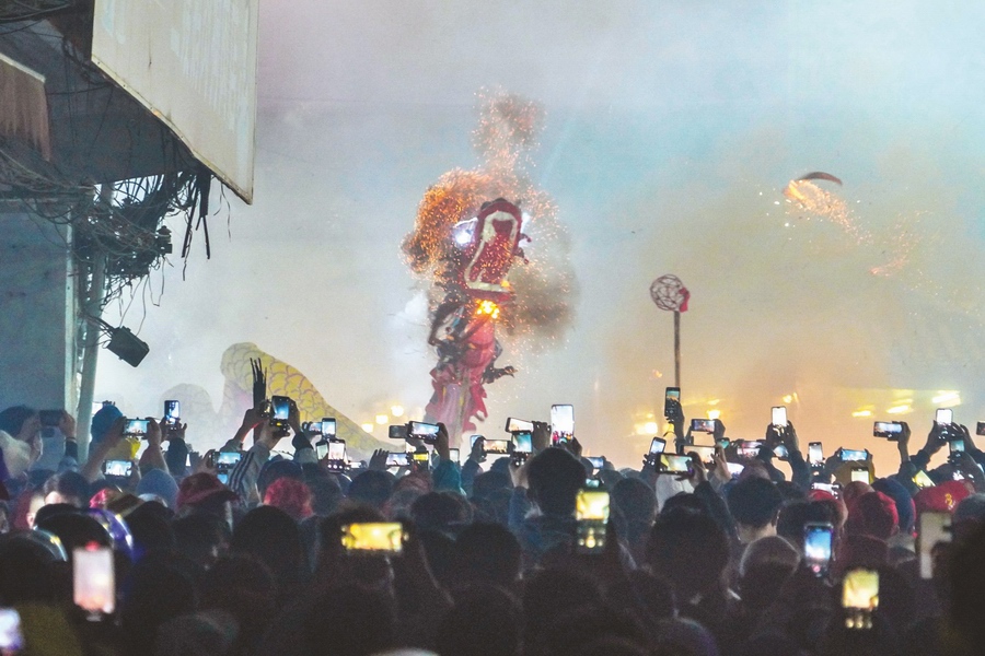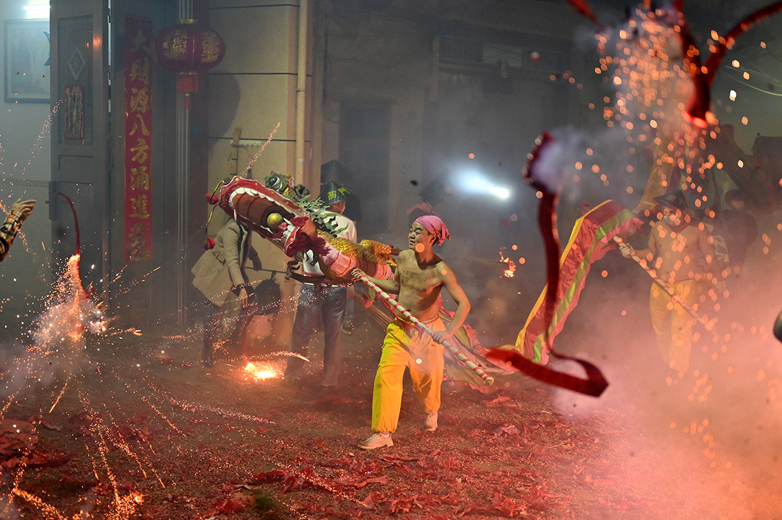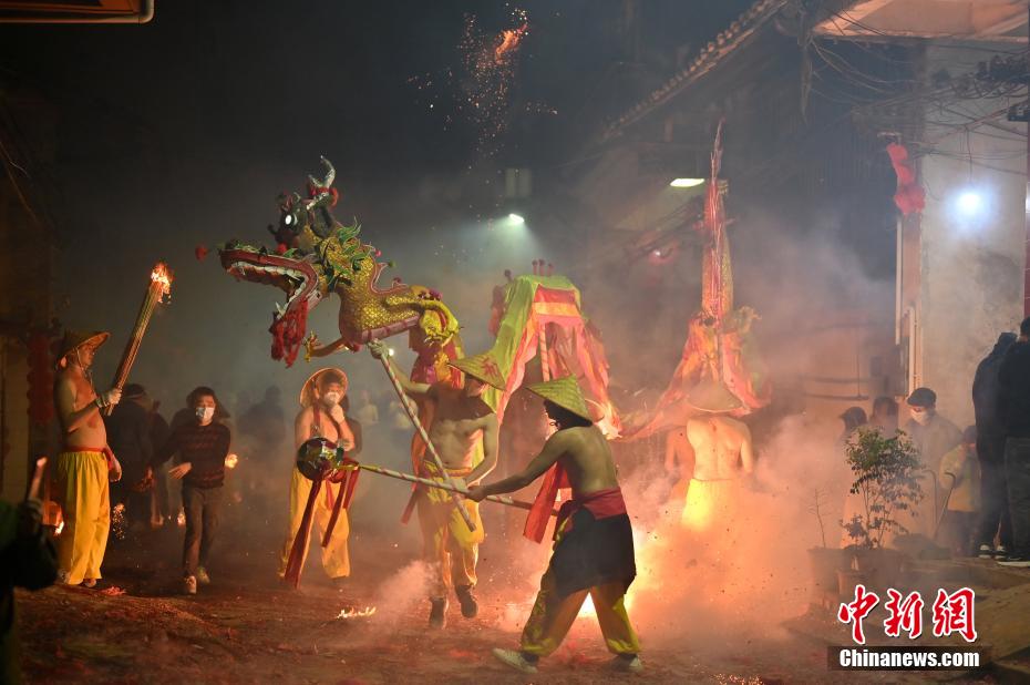 舞龙者穿行炮仗间,欢庆新春。(图片来源:中新网)