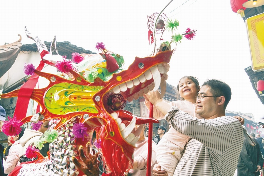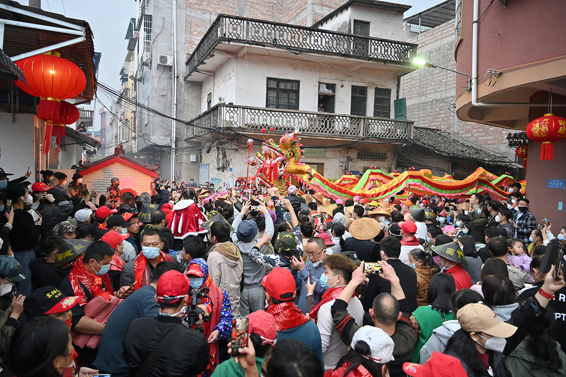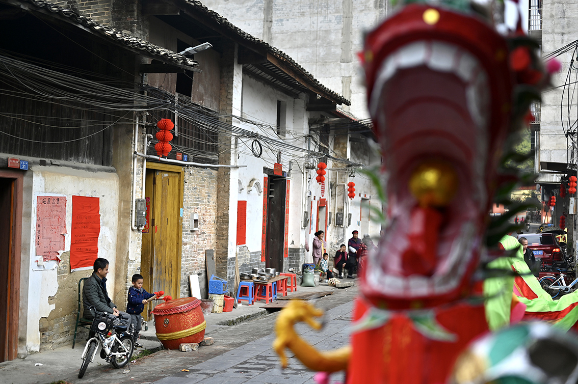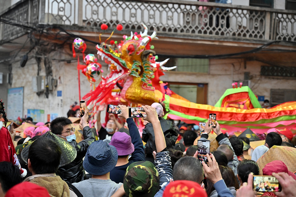 图为舞龙者在街道间挥舞炮龙,庆新春。(图片来源:本文图片除标注外均自中新社)