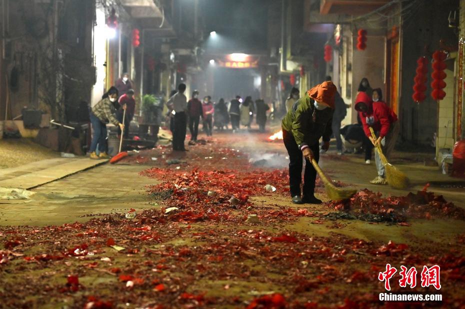 民众自发清理家门前的炮仗碎屑。(图片来源:中新网)