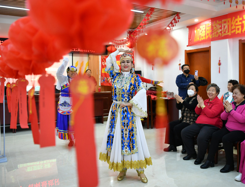 2月2日,中国传统节日元宵节临近,在河北省石家庄市新华区清真寺街社区,民众猜灯谜、学“兔”剪纸,体验制作传统元宵,喜迎元宵佳节。图为民族舞表演。(图片来源:中新社)