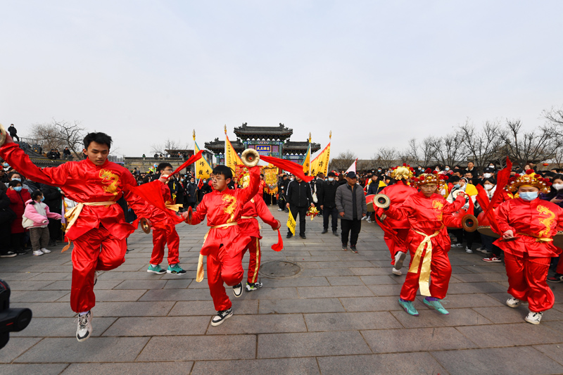 2月2日,在河北省霸州市胜芳古镇,传统元宵花会展演正式拉开帷幕,从农历正月十二到正月十六,50余道花会将纷纷亮相,展示各自绝活。(图片来源:中新社)