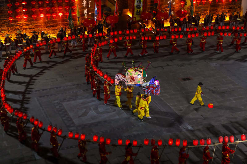 2月1日晚,民间艺人在安徽省黄山市休宁状元广场表演徽州板凳龙。(图片来源:新华社)