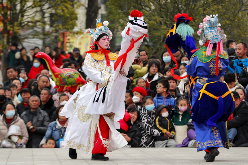 2月1日,民间艺人在安徽省黄山市黄山区表演跳竹马。(图片来源:新华社)