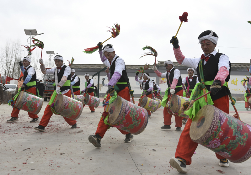 2月1日,乡村秧歌队在甘肃省临夏回族自治州积石山保安族东乡族撒拉族自治县表演秧歌节目“太平鼓”。(图片来源:新华社)