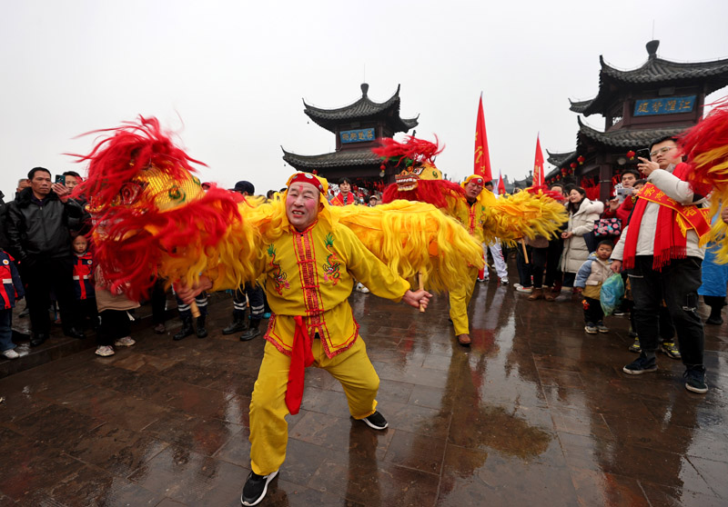 2月6日,民间艺人在全椒县太平桥上进行民俗表演。(图片来源:中新社)