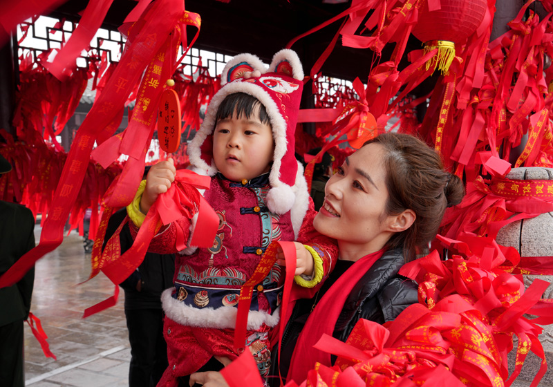 2月6日,一名家长带着小朋友在全椒县太平桥上系“平安带”祈福。(图片来源:新华社)