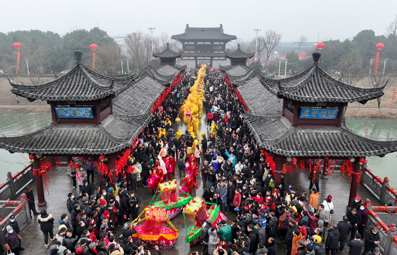 2月6日,文艺表演队伍从全椒县太平桥上经过。(图片来源:香港中通社)