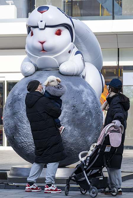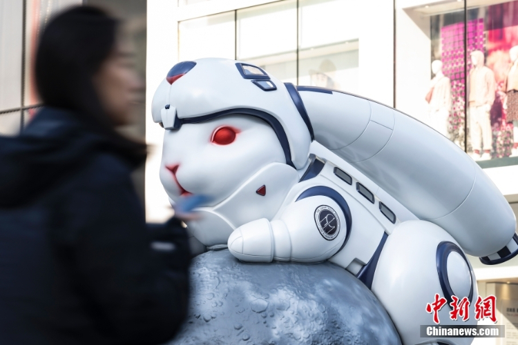 太空兔主题雕塑吸引过往市民目光。(图片来源:中新社)