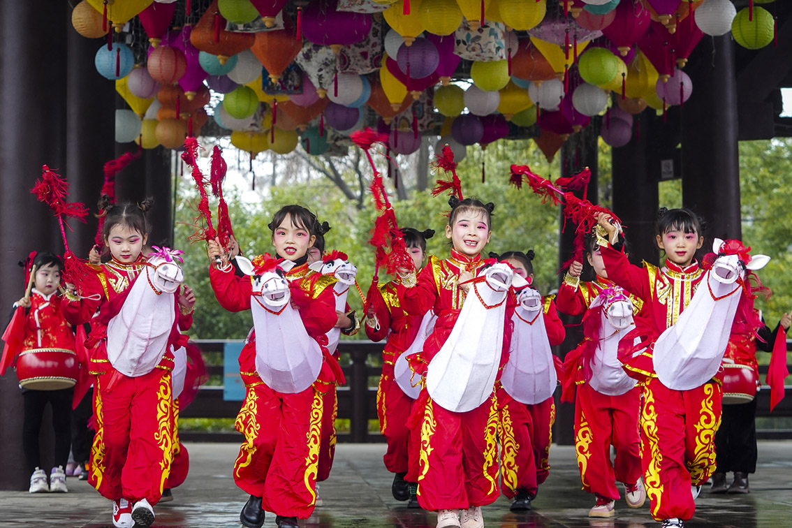 2月6日,浙江省湖州市长兴县陈武帝故宫,长兴开发区中心幼儿园的孩子们在体验非遗马灯舞蹈。(图片来源:本文图片除标注外均自新华社)