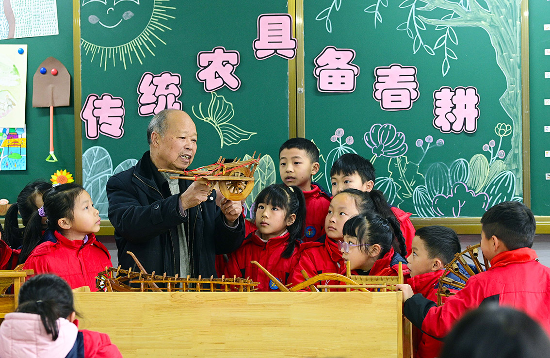 2月6日,江西省宜春市万载县第五小学,传统农耕微缩农具制作老师郭西灿给学生介绍传统农耕文化。