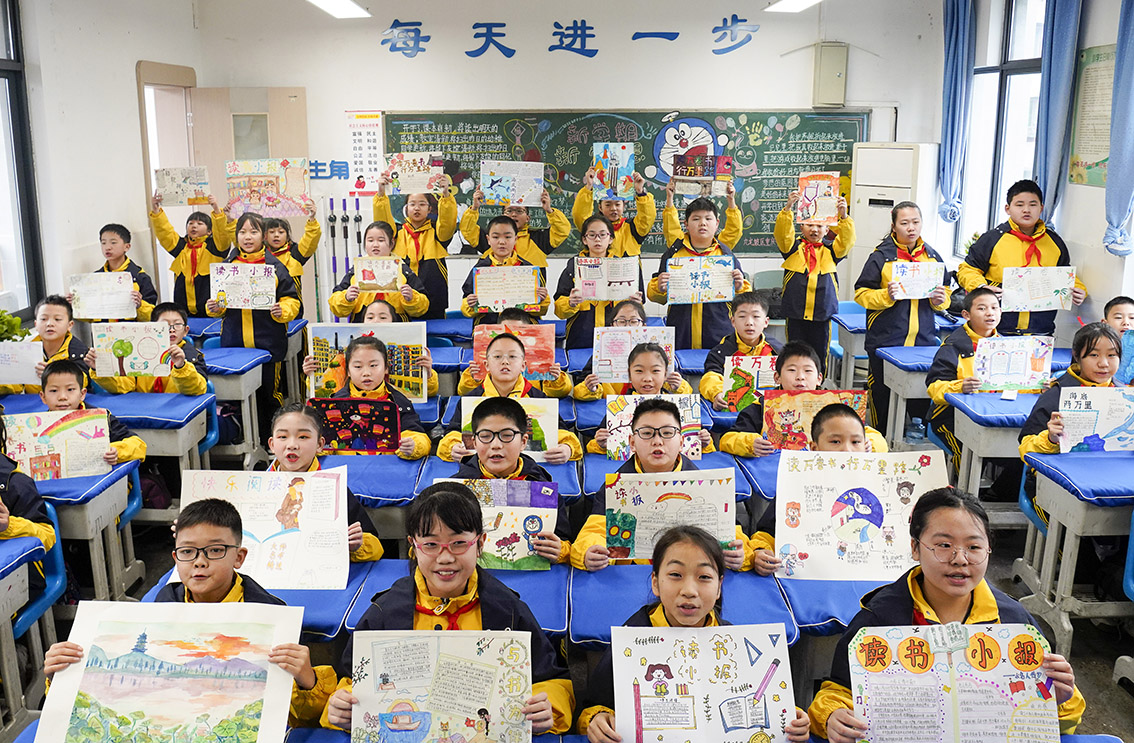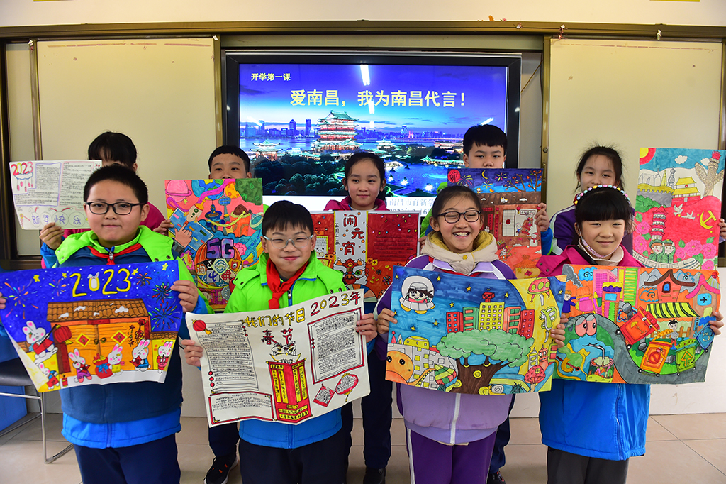 2月6日,江西南昌育新学校教育集团的同学们展示“美好家乡”手抄报。(图片来源:人民网)