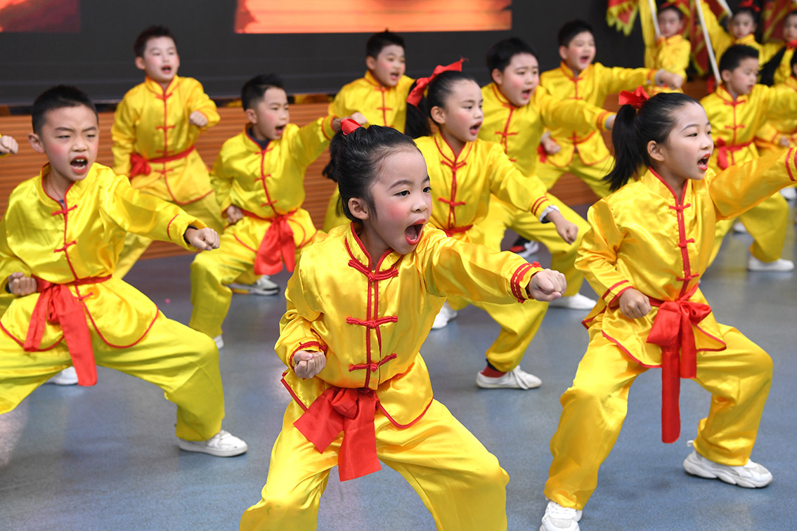 2月6日,学生在广西南宁市滨湖路小学教育集团滨湖校区开学仪式上表演武术。