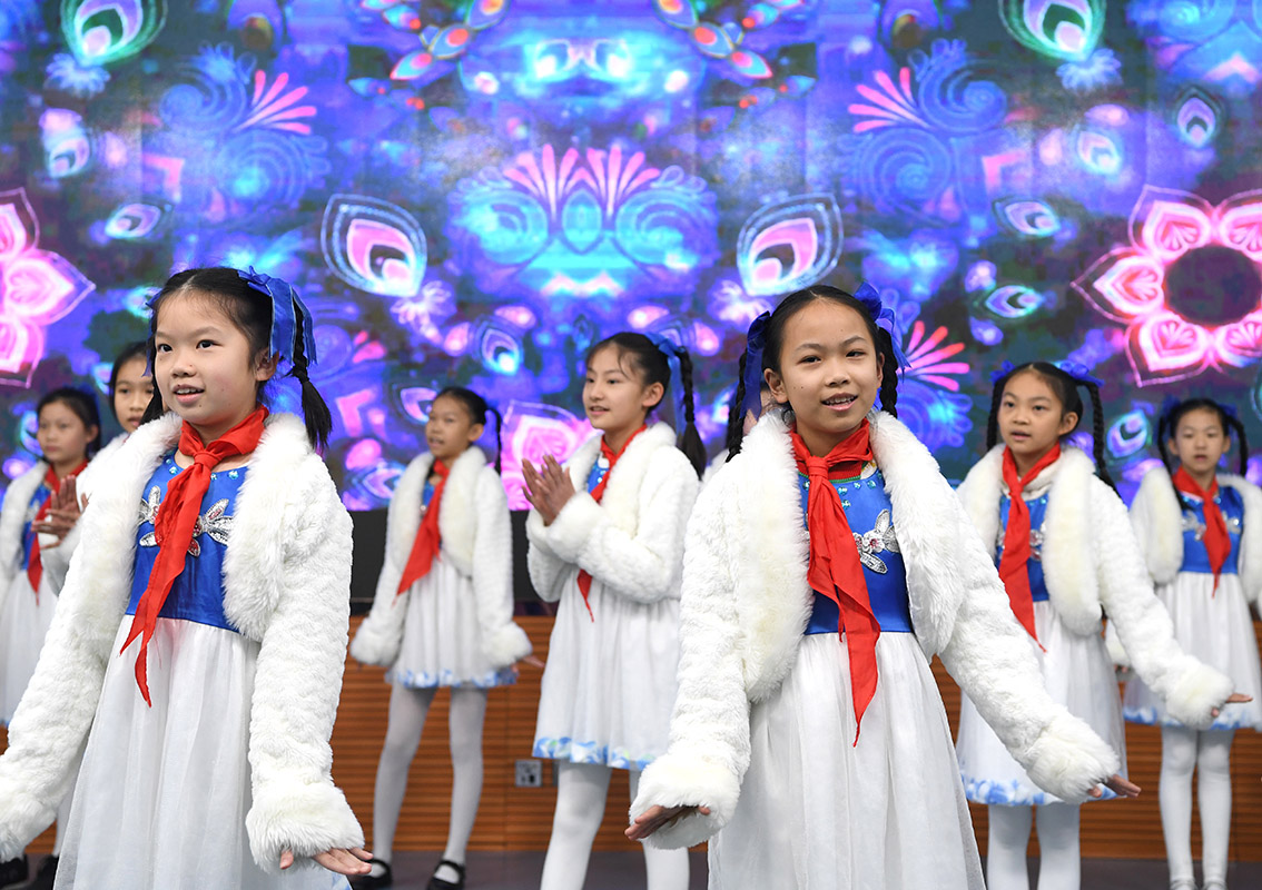 2月6日,学生在广西南宁市滨湖路小学教育集团滨湖校区开学仪式上合唱歌曲。