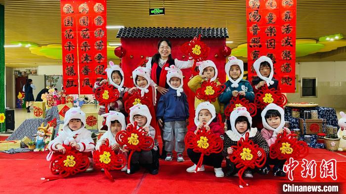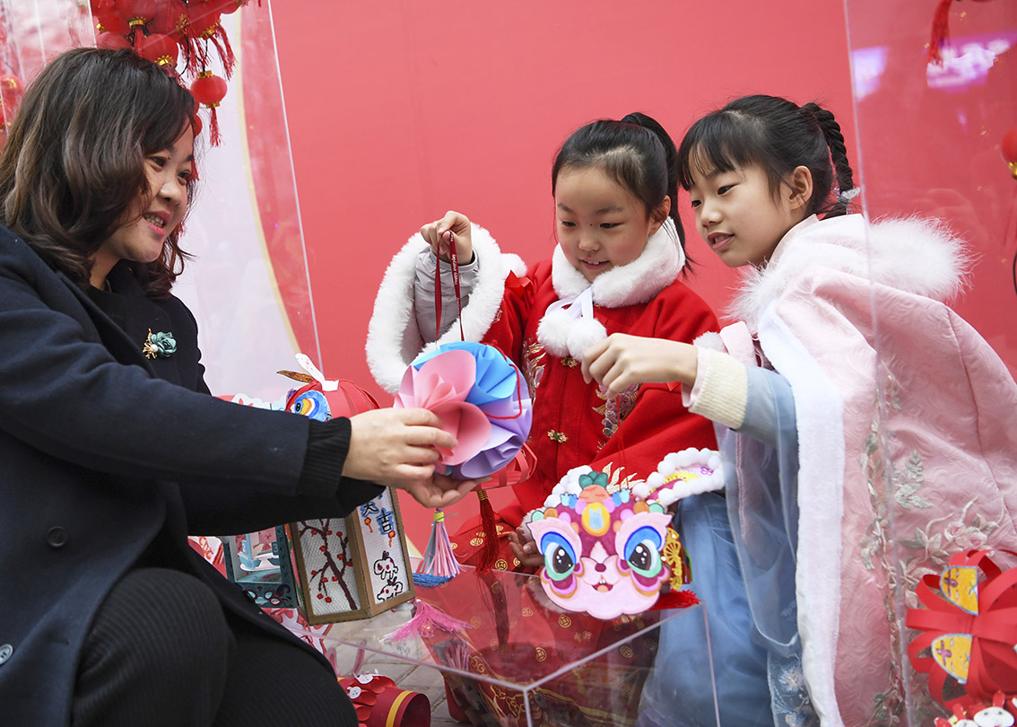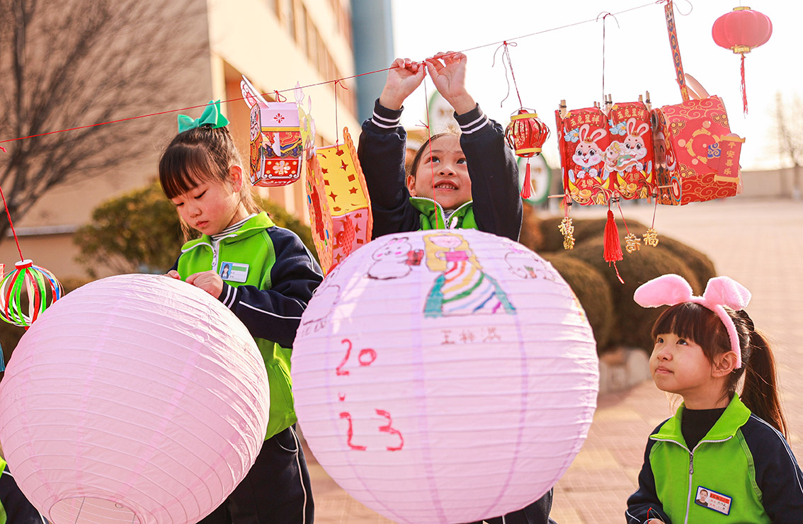 2月7日,在山东省荣成市蜊江小学,小学生们通过挂灯笼、制作糖葫芦、画萌兔等丰富多彩的活动,迎接新学期。(图片来源:中新社)