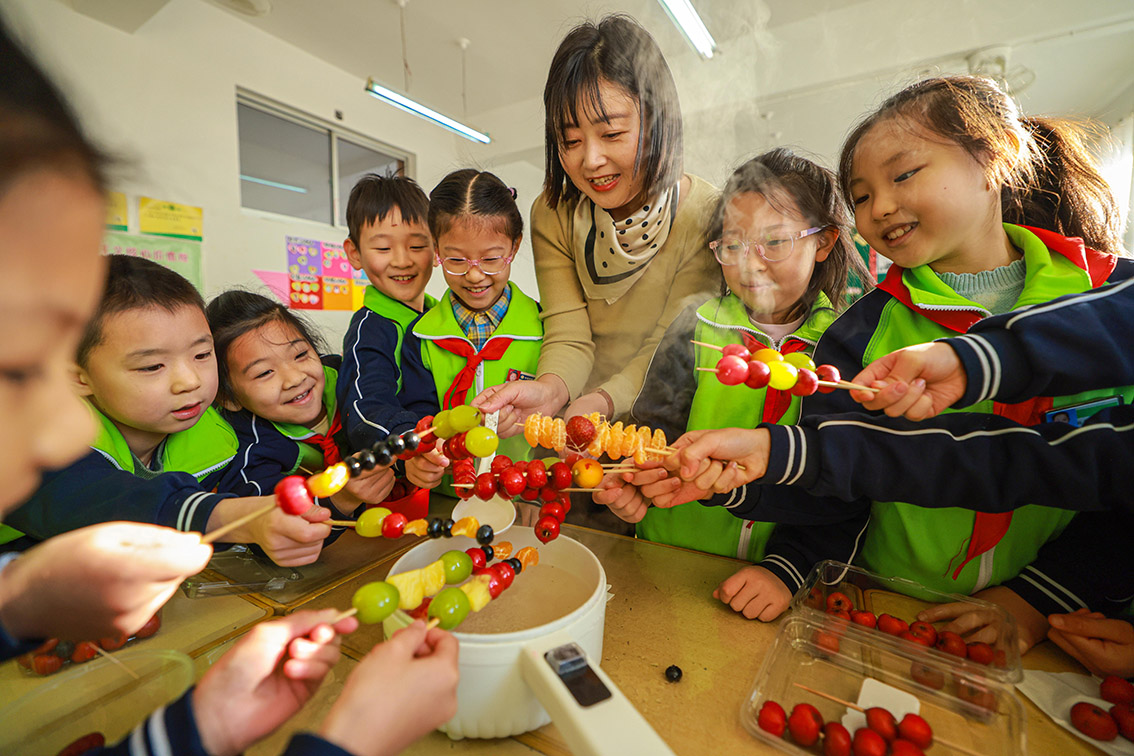 2月7日,山东省荣成市蜊江小学的师生在教室内制作糖葫芦。