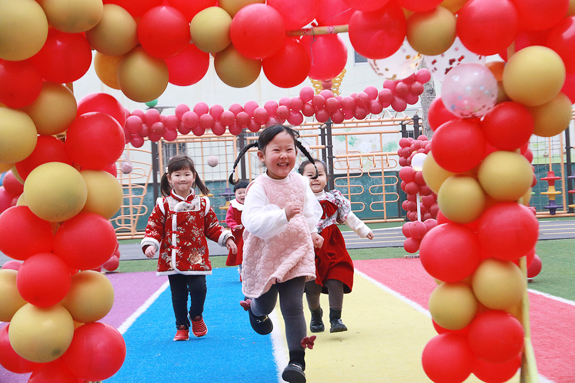 2月7日,山东省高密市金苹果幼儿园的孩子们在操场奔跑。
