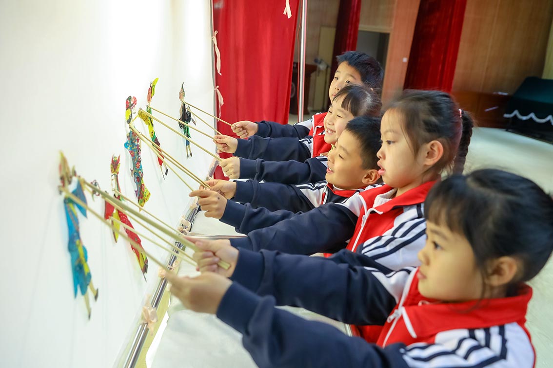 2月6日,学生体验皮影戏表演。当日是山东省青岛市中小学2023年春季学期开学首日。当地一小学开展“非遗”进校园开学典礼活动,学生通过体验剪纸、皮影戏等非物质文化遗产项目,近距离感受“非遗”魅力。(图片来源:中新社)