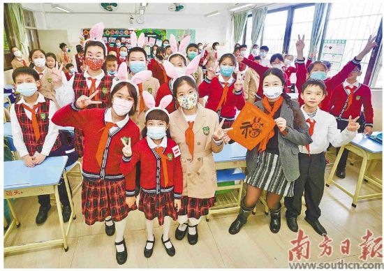 2月6日,广州市朝天小学的“小兔子”们将新年祝福送到每个班级里,老师与同学们一起合影留念。(图片来源:《南方日报》)