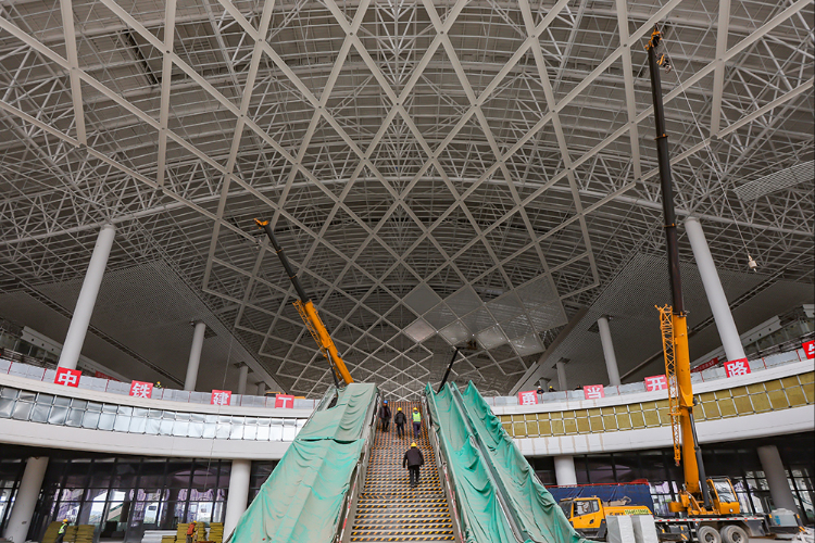 2月7日,工人在江苏南沿江铁路江阴站站房作业。(图片来源:新华网)