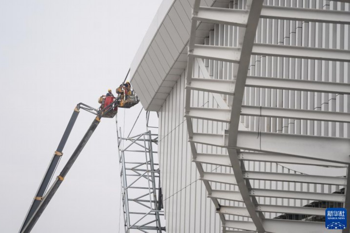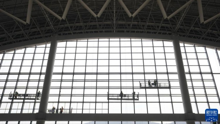 【欧洲时报网】2月7日,工人在江苏南沿江铁路江阴站站房作业。