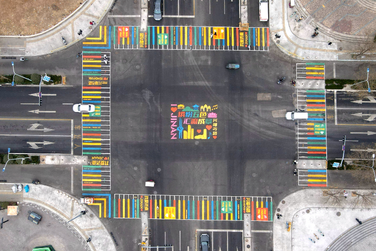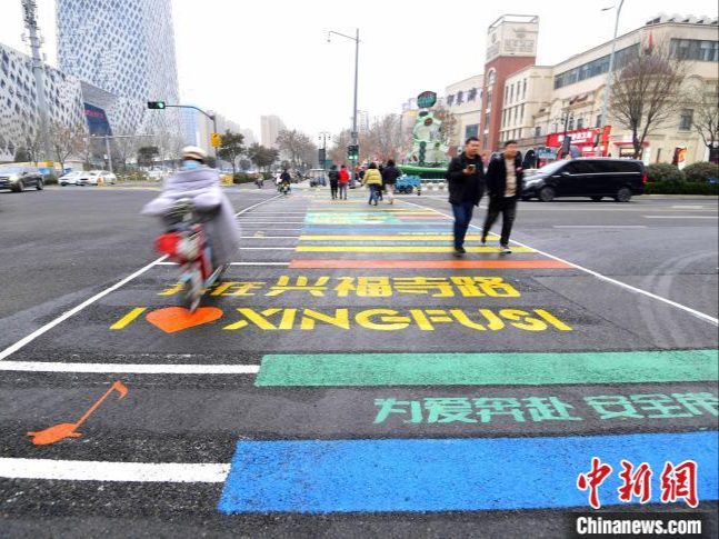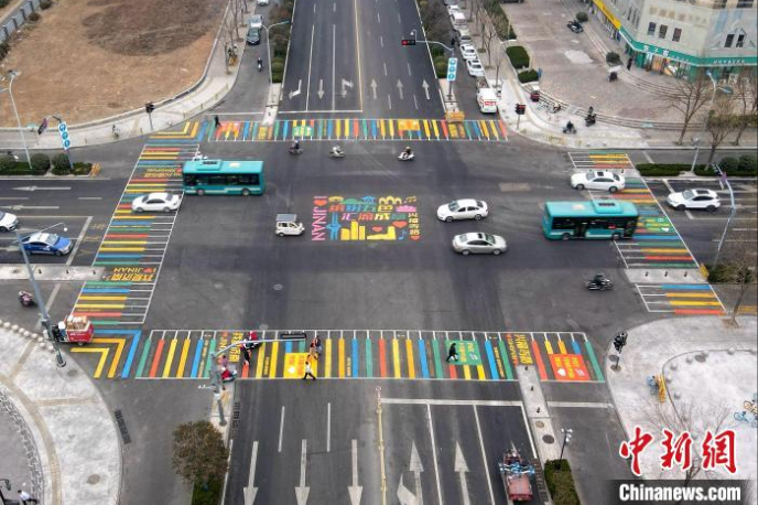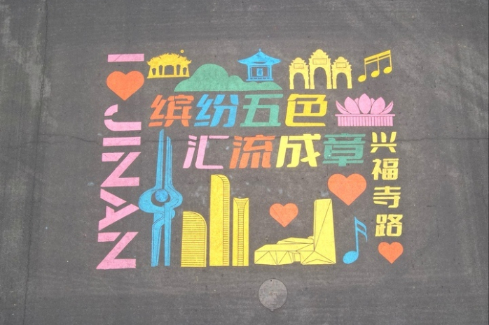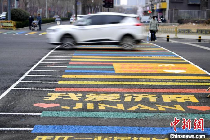 斑马线中间画着“我爱济南”等彩色标语。(图片来源:中新网)