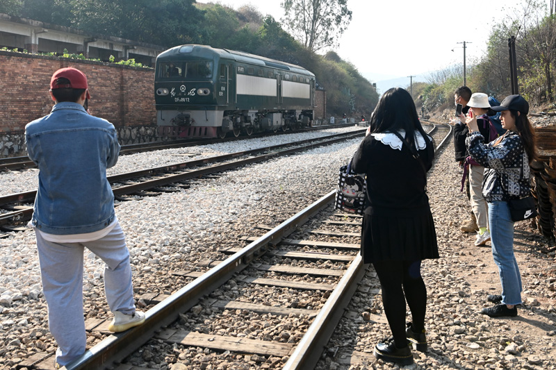 2月11日,云南省开远市,游客拍摄运行中的火车车头。正值周末,游客乘坐开远市南北轨道交通列车体验滇越铁路“旧时光”。(图片来源:中新社)