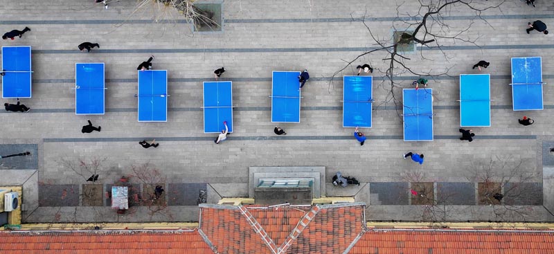 2月11日,健身爱好者在山东省滕州市弘道公园打乒乓球。(图片来源:新华社)