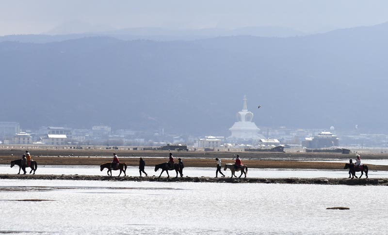 2月11日,游客在云南省香格里拉市纳帕海湿地骑马游玩。(图片来源:新华社)