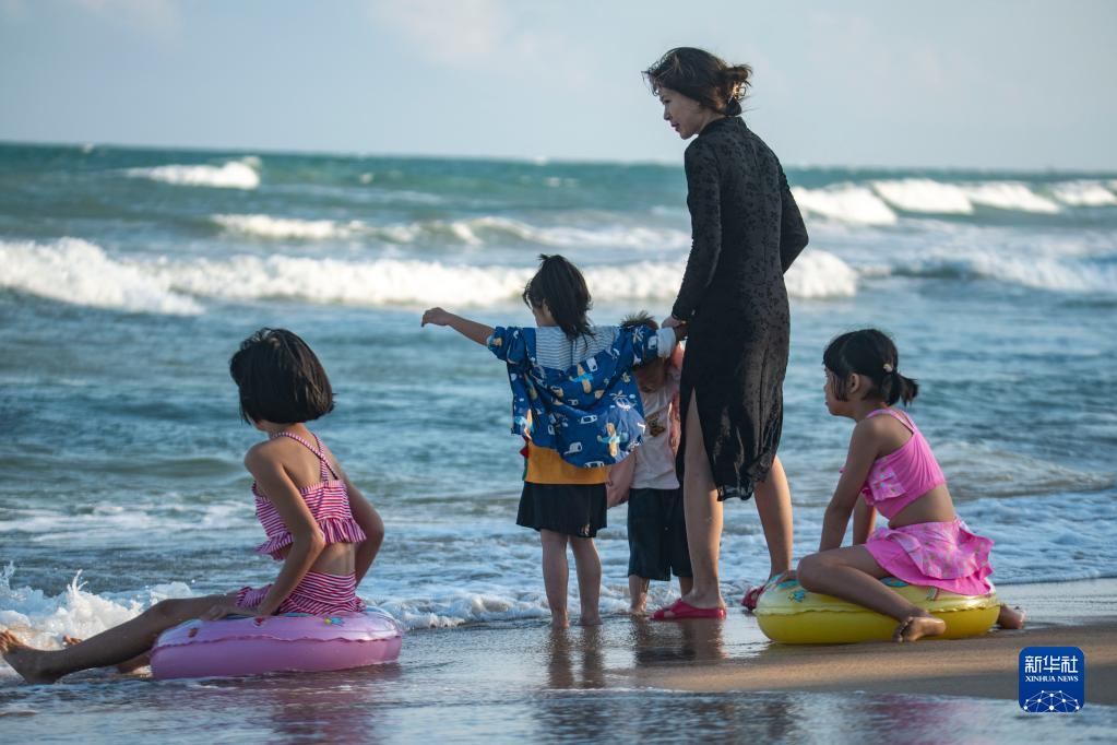 2月11日,一名家长带着孩子在海南省琼海市博鳌海滨戏水玩耍。早春时节,海南天气晴好,人们纷纷利用周末到海边休闲娱乐,乐享春光。(图片来源:新华网)