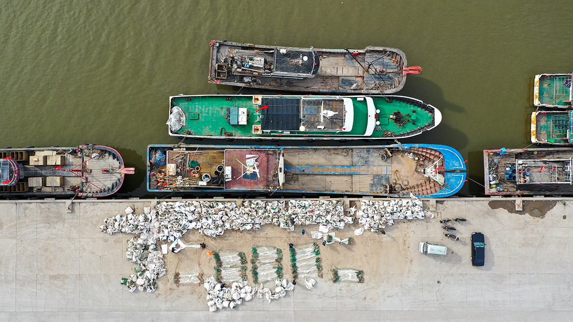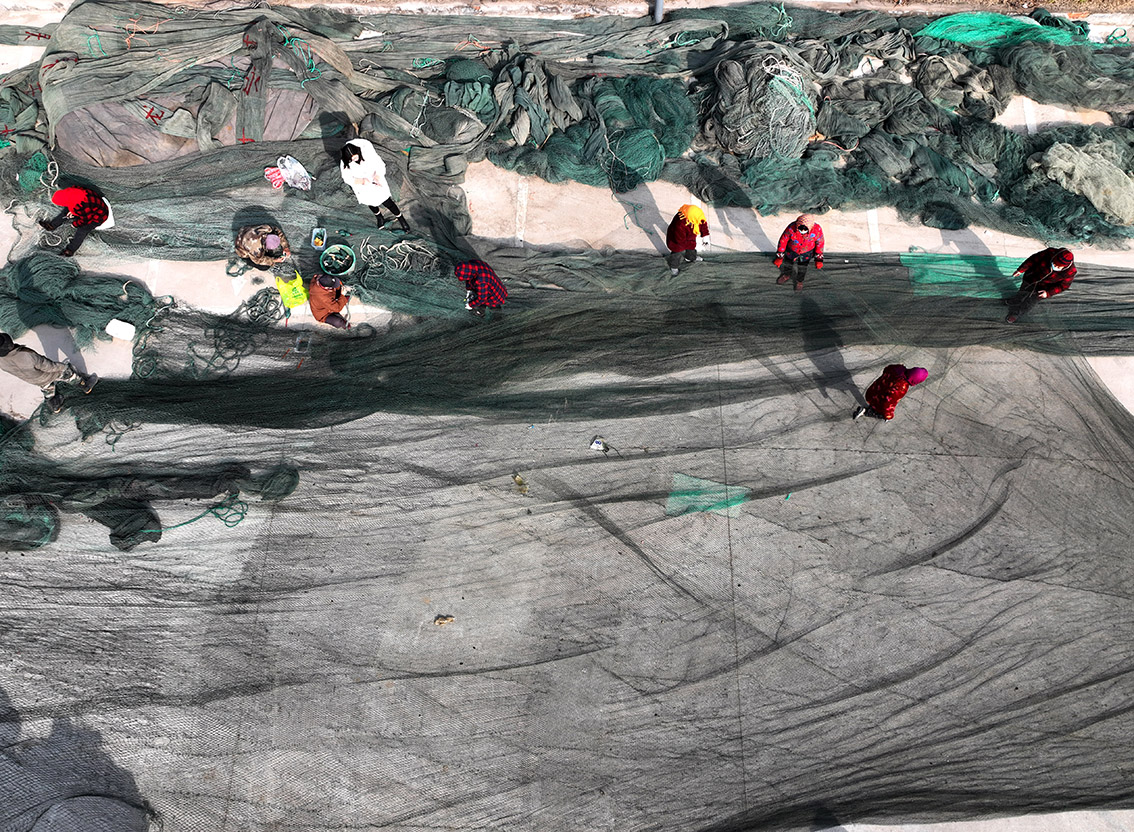 2月15日,在唐山市丰南区黑沿子渔港码头,渔民在整理渔网(无人机照片)。连日来,河北省唐山市丰南区黑沿子渔港码头一派忙碌景象,当地渔民抓紧时间修整渔船、修补渔网,为春季出海捕捞做准备。(图片来源:新华社)