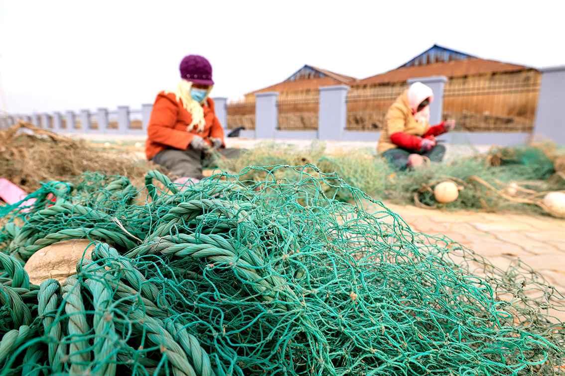 2月15日,在唐山市丰南区黑沿子渔港码头,渔民在整理渔网。(图片来源:新华社)