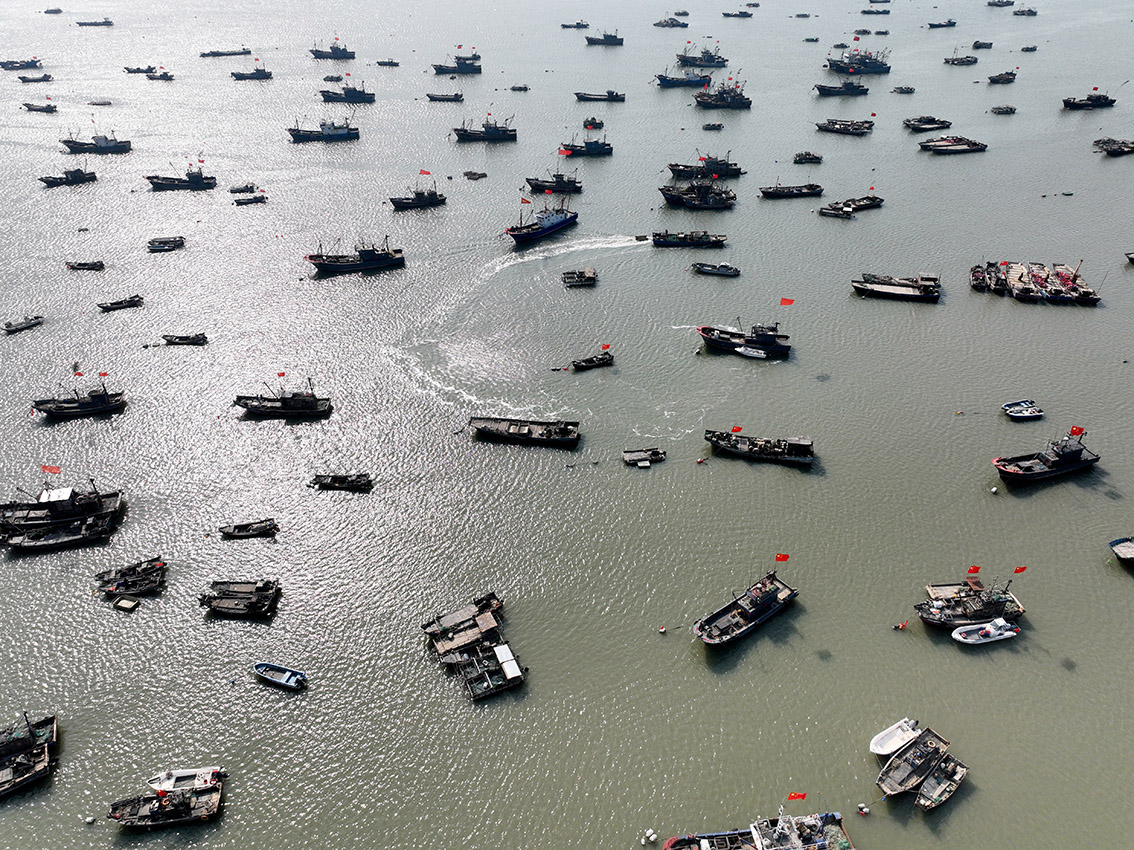 2023年2月16日,在江苏省连云港市连云区连岛中心渔港内,渔船整装待发。(图片来源:中新社)
