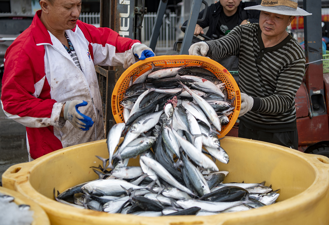 2023年2月2日,海南省文昌市清澜港的渔民在码头装卸海鱼。(图片来源:中新社)