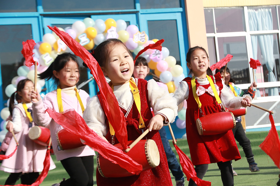 2月20日,山东省高密市密水街道中心幼儿园的孩子们在打腰鼓。(图片来源:本文图片除标注外均自新华社)