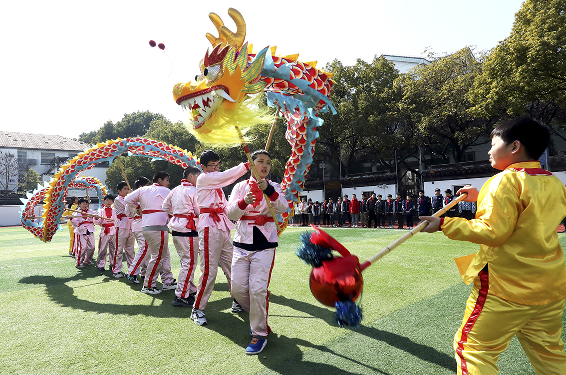 2月20日,江苏省苏州市昇平实验小学校学生表演舞龙,迎接“二月二”。