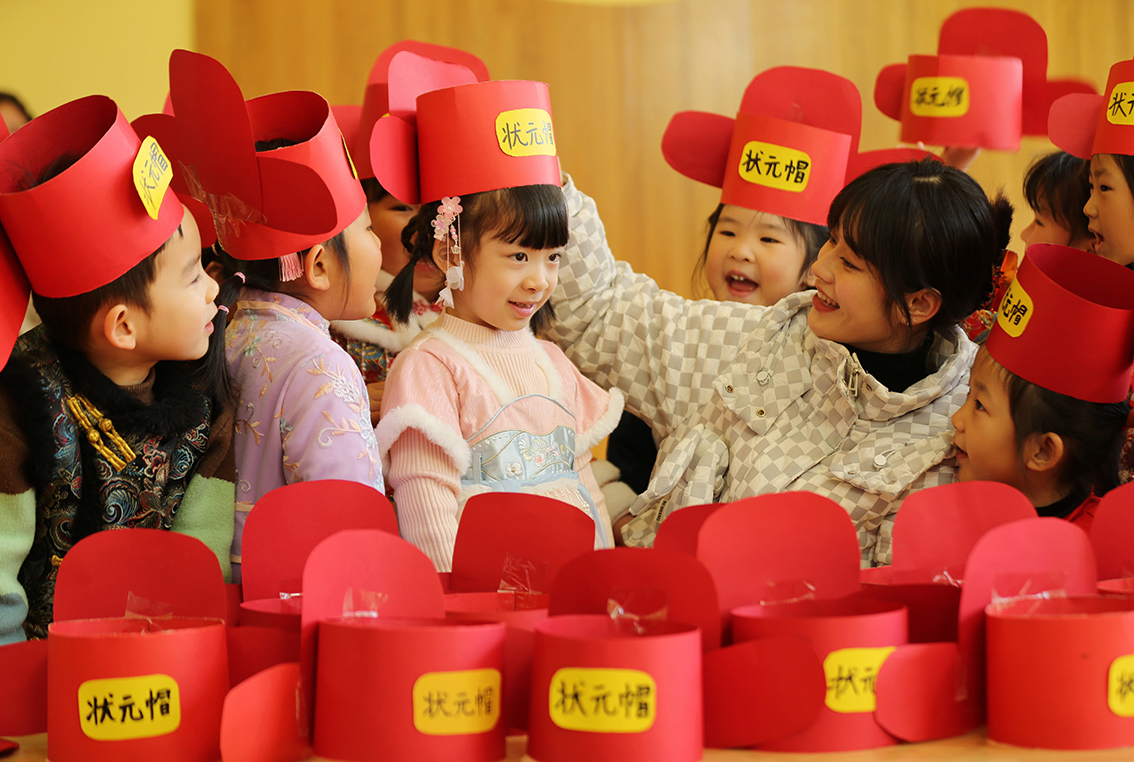 2月20日,山东省临沂市沂南县第二实验幼儿园的孩子们在老师的带领下制作“状元帽”,寓意开启聪明与智慧。