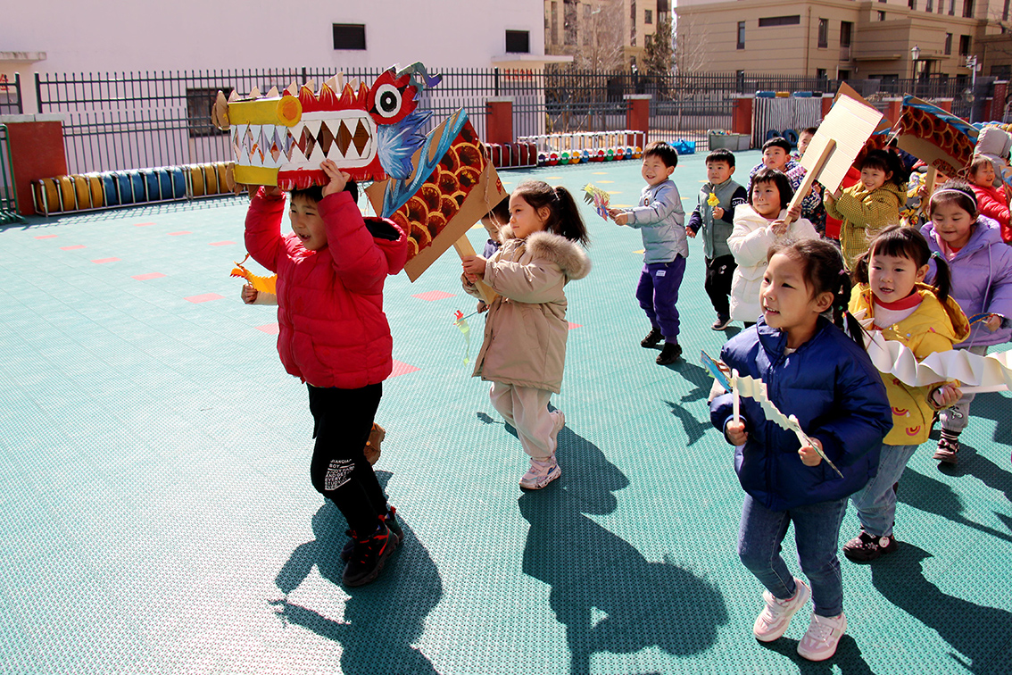 2月20日,山东省青岛西海岸新区胶南中心幼儿园的小朋友在“二月二龙抬头”主题活动中用自制的道具舞龙。