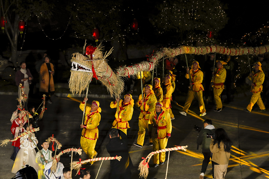2月17日,村民正在表演非遗民俗“蜀源草龙”。临近农历二月初二“龙抬头”,在安徽省黄山市徽州区潜口镇蜀源村,村民以“五谷之王”的稻草为主要材料,编扎成一条12米长的稻草龙在村中舞动,祈福五谷丰登。(图片来源:中新社)