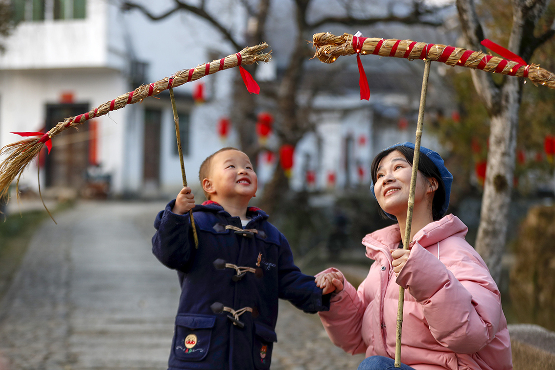 2月17日,游客在安徽省黄山市徽州区潜口镇蜀源村体验非遗民俗“蜀源草龙”。(图片来源:中新社)